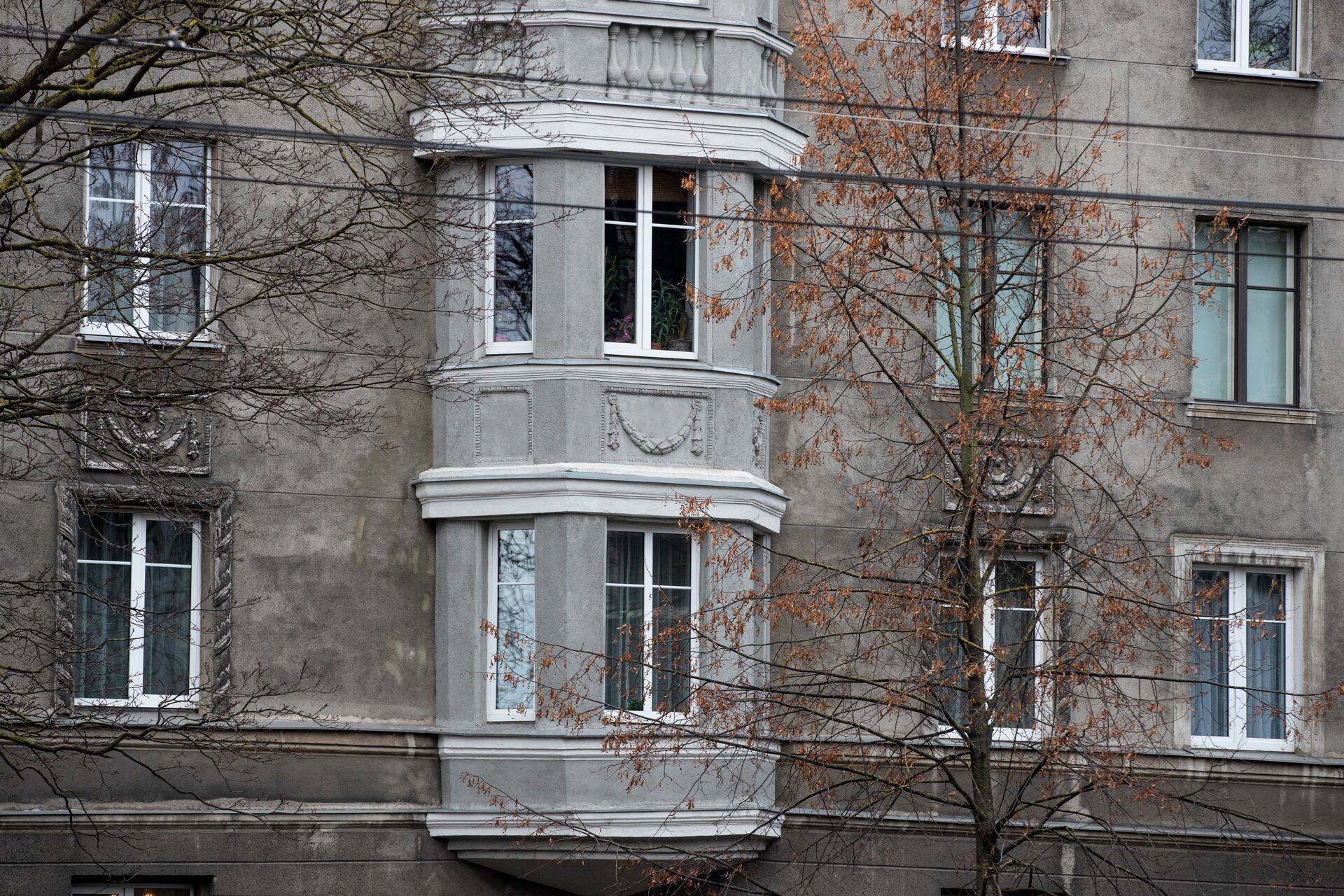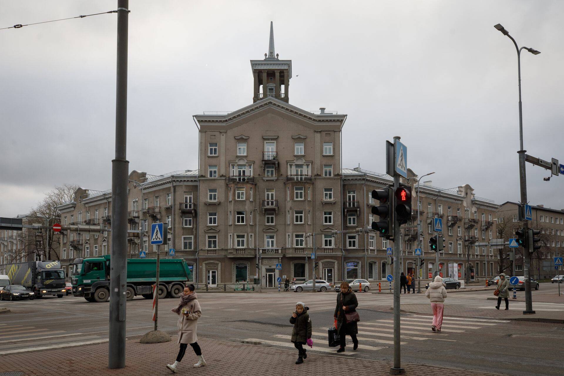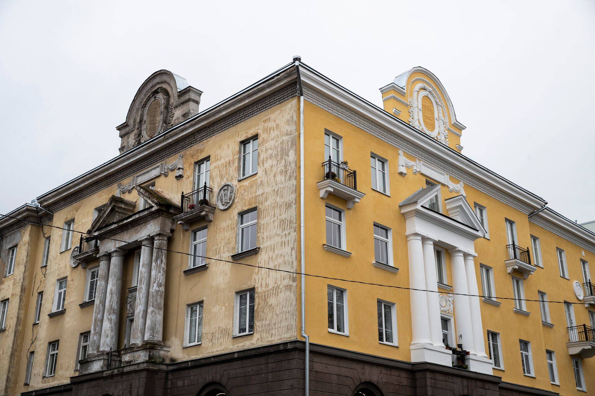 Украшенный советской символикой многоквартирный дом на Пярнуском шоссе.