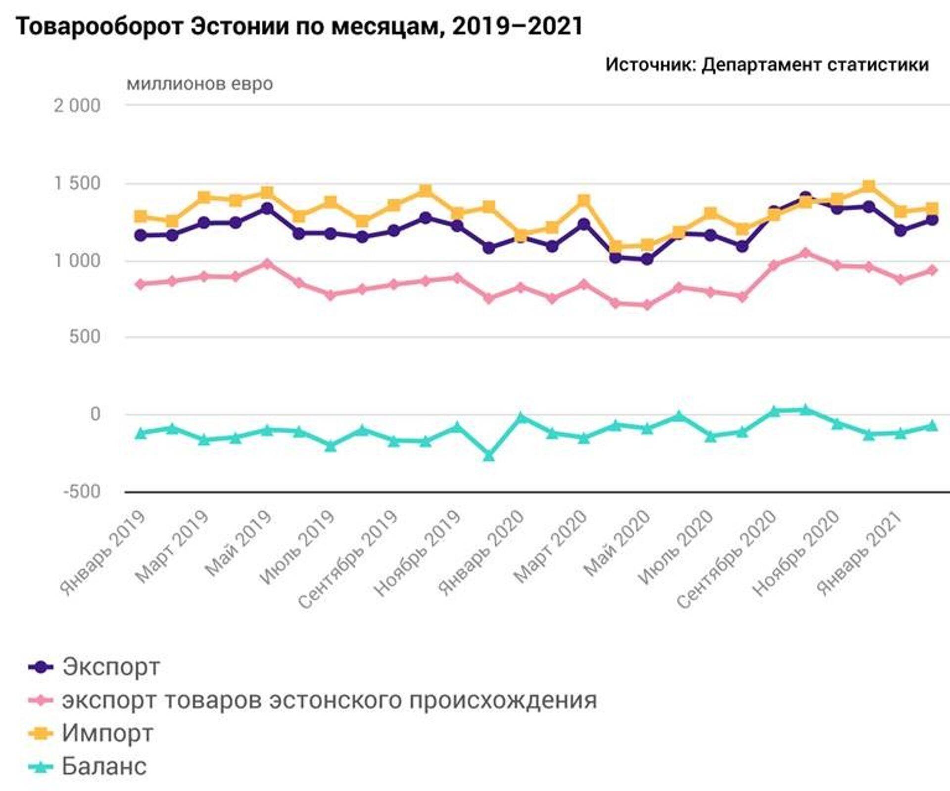 В феврале из Эстонии экспортировано и импортировано в Эстонию товаров в текущих ценах на 1,3 млрд евро. Дефицит товарообмена составил 73 млн евро и по сравнению с февралем прошлого года сократился на 49 млн евро,