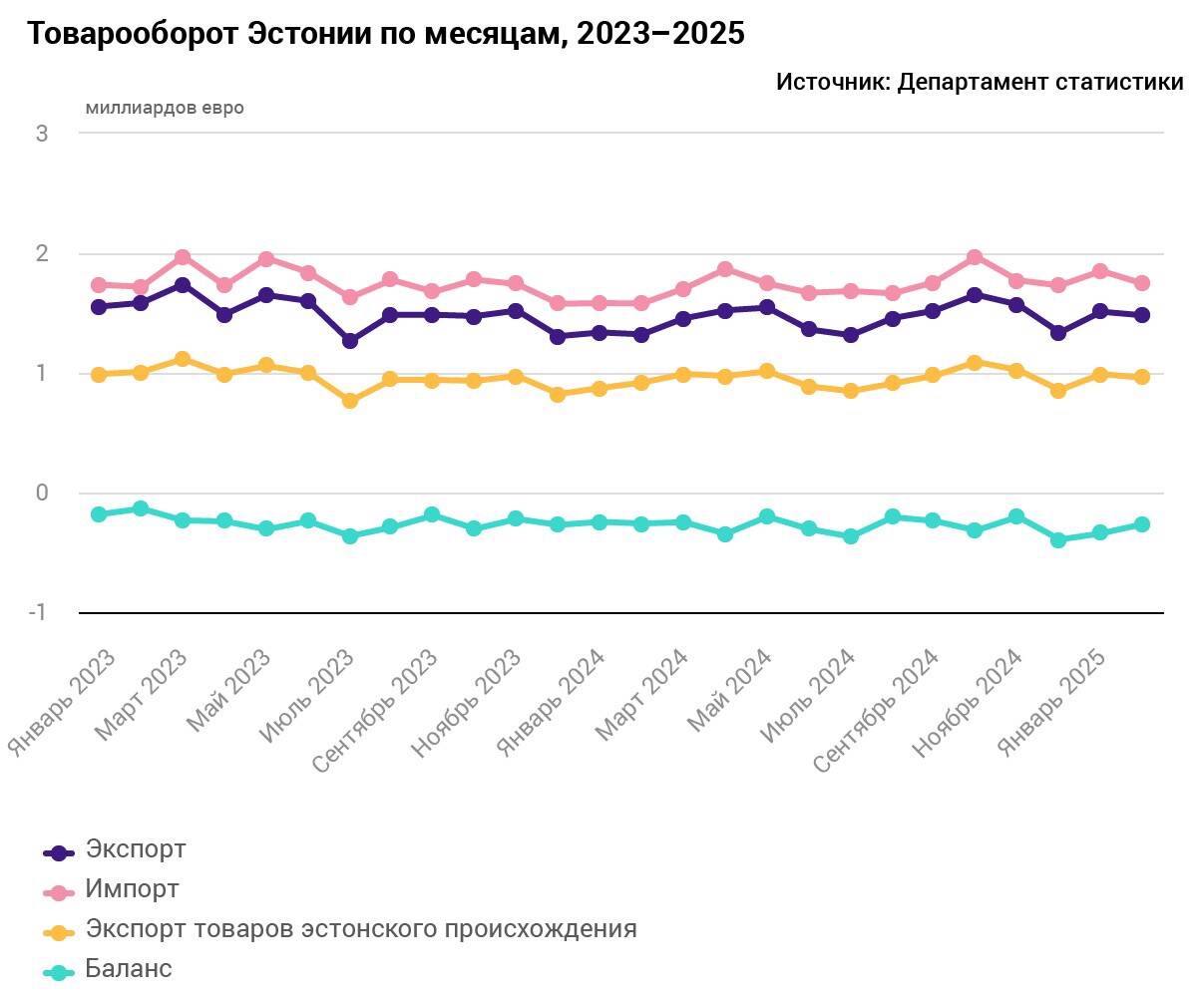 По данным Департамента статистики, в феврале 2025 года экспорт товаров увеличился на 12%, импорт – на 10%. Товаров было экспортировано в текущих ценах примерно на 1,5 млрд евро и импортировано более чем на 1,7 млрд евро. Дефицит товарооборота составил 264 млн евро, что на 5 млн евро больше, чем годом ранее, сообщается в пресс-релизе.